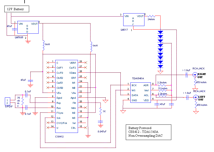 Here's the schematic. TDA1545 (and TDA1545A) accepts only EIAJ input format (I learned this the hard way), and not I2S so CS8412 needs to be configured to output EIAJ. CS8412 datasheet says it needs to be configured for Mode 5, thus only M2 and M0 are tied to 5V. The string of diodes is to give 2/3*Vcc reference to L/R output and Reference pin. Idea given by Thorsten Loesch on diyaudio.com/forums. You could use 3 pcs of AA cells as well, if you wish.