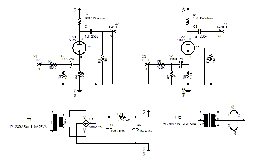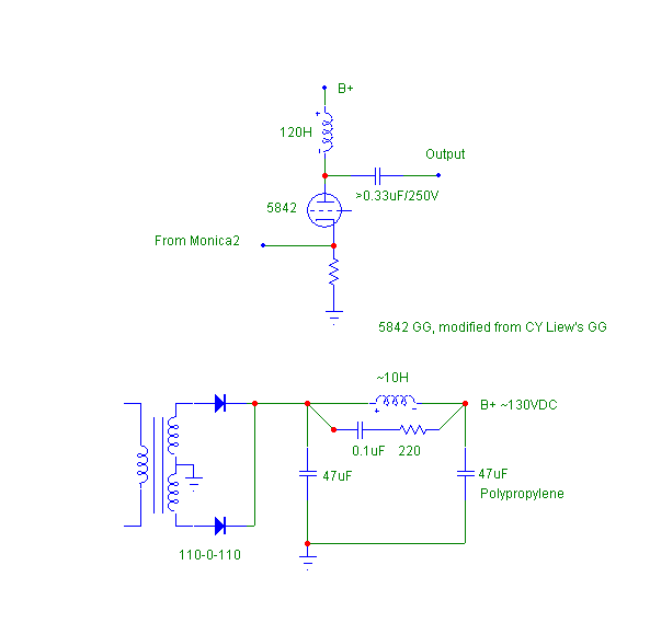 Schematic below shows a R and C across the 10H choke. This is to "tune" the choke to 100Hz power supply noise. 5842 cathode resistor is still 160ohms.