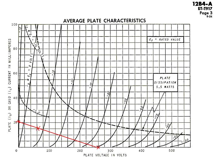 Here is the curves for 12B4 and loadline for the "Etude" preamp. Note that the grids are spaced 10V apart. This is with B+ of 260V, plate of 12kohm and cathode of 470ohm. I got about ~7V for the grid which will be hard to estimate from the curves. Now this curve also shows you "Plate Dissipation". Whichever operating point you choose, make sure it doesn't stray beyond this curve. Make sure that all points are to the left and below this curve. A short tube lifetime is only a tube reseller's idea of fun, okay? Err, why at 7V when there are so many points to choose from? Since this is a linestage, it won't see more than 3V incoming signal, so it's still okay. Adapt it to your system.